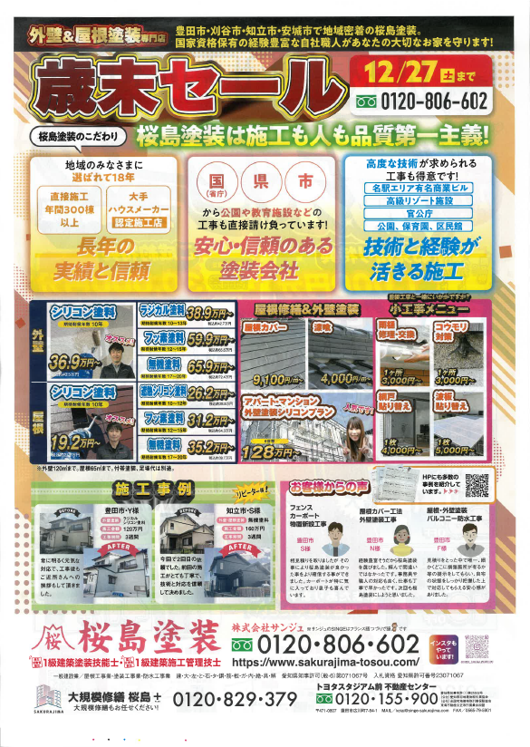 桜島塗装は、豊田市・刈谷市を中心に高品質&低価格な外壁塗装・屋根工事・雨漏り修理・内装工事をご提供する専門店です!